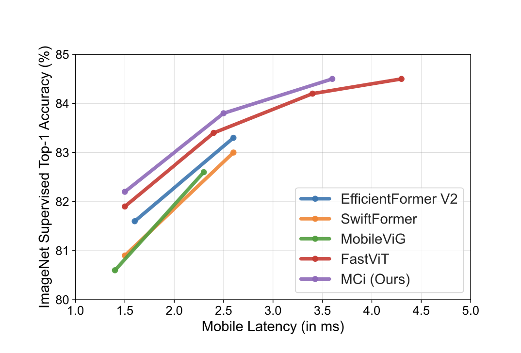 - MCi2 matches FastViT on ImageNet (84.5%) while being 15% faster and 14.3% smaller