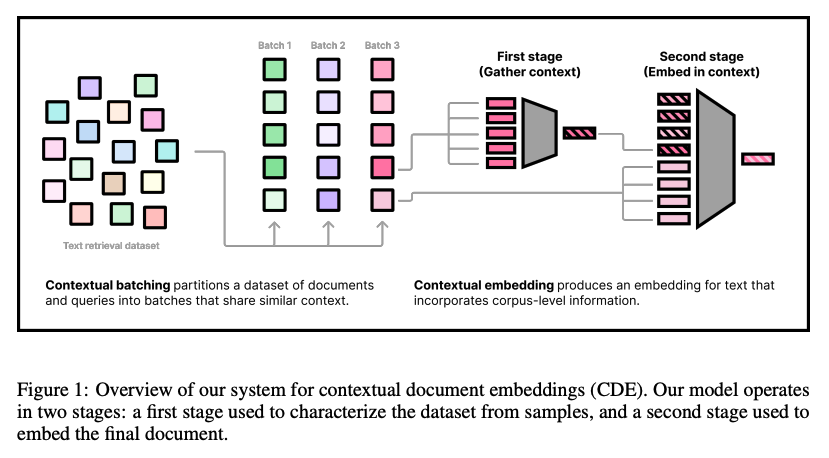 Contextual Document Embeddings (CDE) November 30, 2024 1 min read #embeddings [2410.02525] Contextual Document Embeddings GitHub - jxmorris12/cde: code for training & evaluating Contextual Document Embedding models embeddings